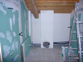 La soluzione adottata, per adesso non fotografata, è stata influita dalla massicia presenza di travi in spessore nel solaio.